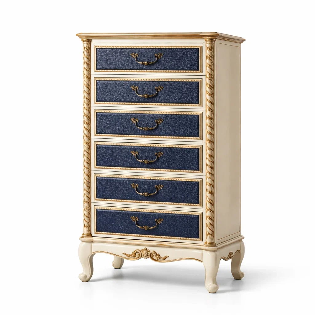 Chiffonnier en bois massif avec une structure solide et des tiroirs en MDF, ornés de poignées en métal doré. La couleur bleu des tiroirs apporte un style distinct.