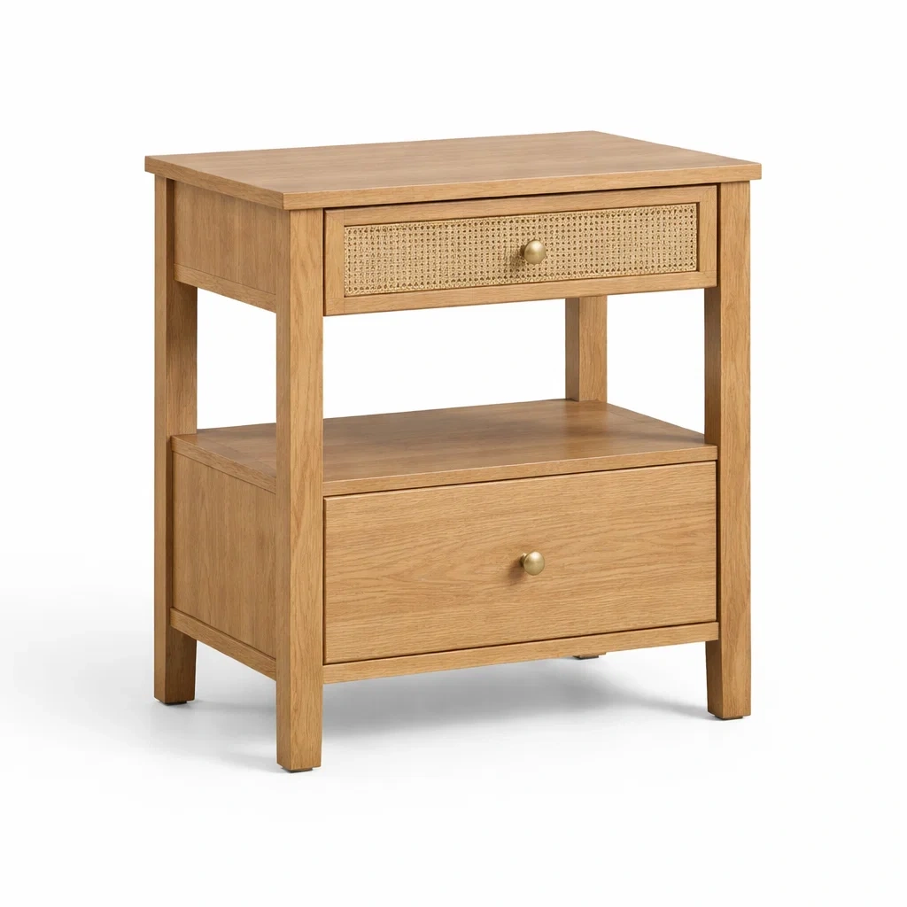 Cette table de chevet est fabriquée en contreplaqué de chêne. Elle dispose de deux tiroirs, l'un en osier avec des poignées en métal et l'autre en contreplaqué. La table a des dimensions de 60 cm de hauteur, 40 cm de largeur et 30 cm de profondeur. Son poids est de 7.5 kg.